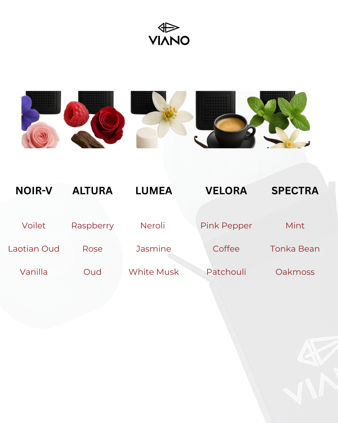 Luxury grade fragrances diffused into a fine mist, to be recharged only once a month and refilled once a quarter